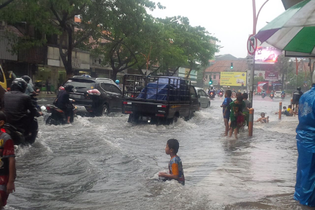 Banjir di Jalan Blauran Surabaya Jadi Ajang Bermain Anak-anak