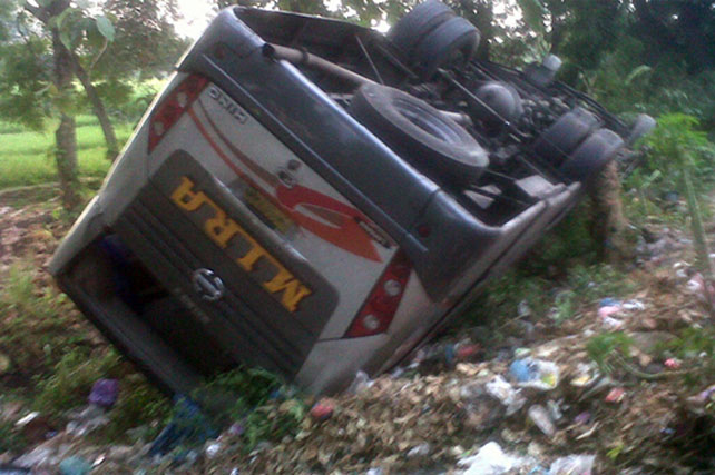 Bus Harapan Jaya Tabrak Motor, Diamuk dan Digulingkan Massa