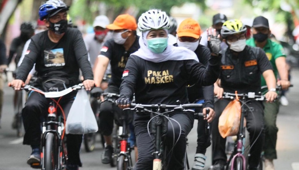 Gowes di Tulungagung Sambil Bagi Masker, Khofifah Ingatkan Sanksi Protokol Kesehatan