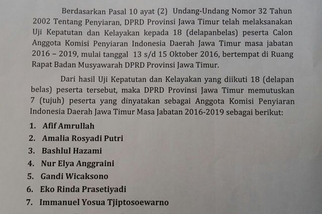 DPRD Jatim Umumkan Tujuh Komisioner KPID Jatim Terpilih