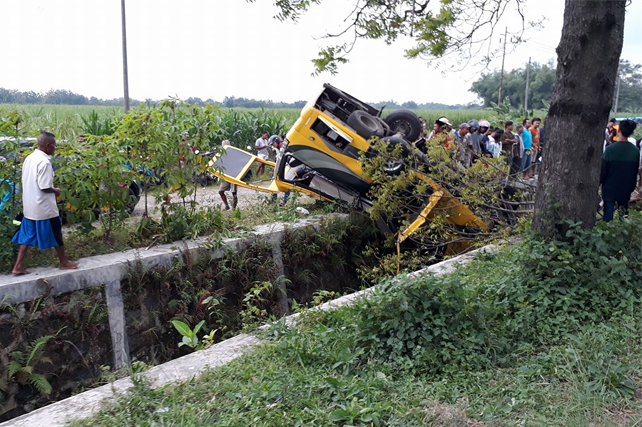 Pulang dari Pernikahan, Mobil Elf Terguling dan Masuk ke Parit di Magetan